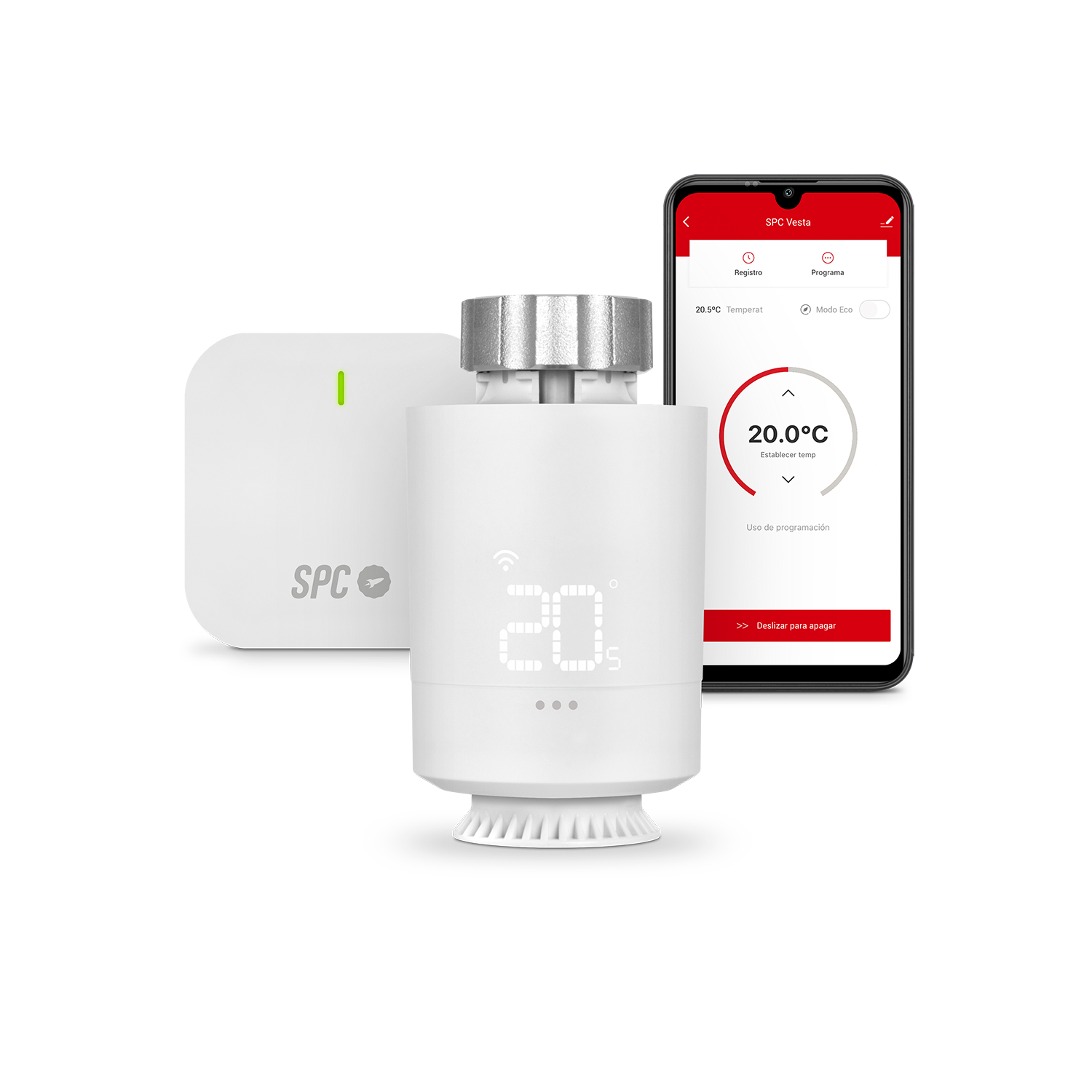 Conjunto de válvula termostática inteligente e Porta de ligação para controlar a temperatura de cada radiador da sua casa. Compatível com o sistema Vesta e controlado através da aplicação SPC IoT. Poupe energia e adapte o ambiente às suas necessidades diárias