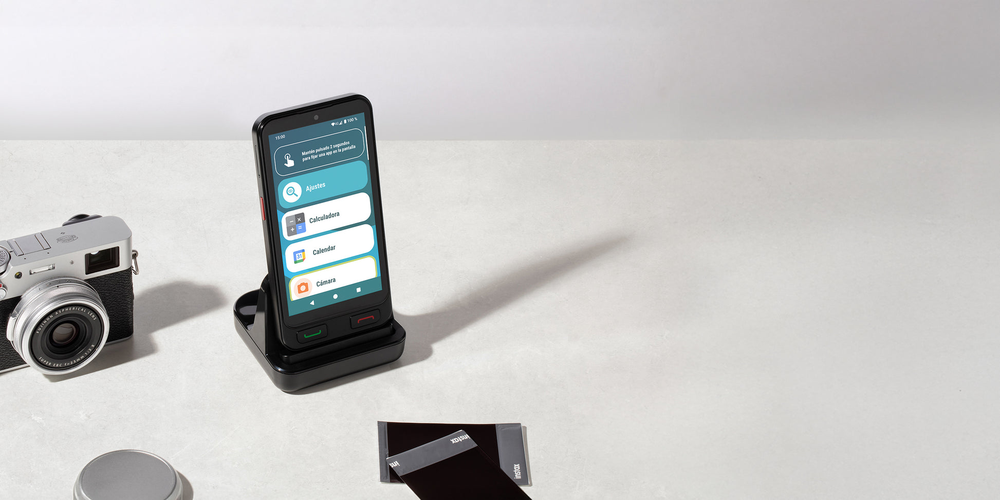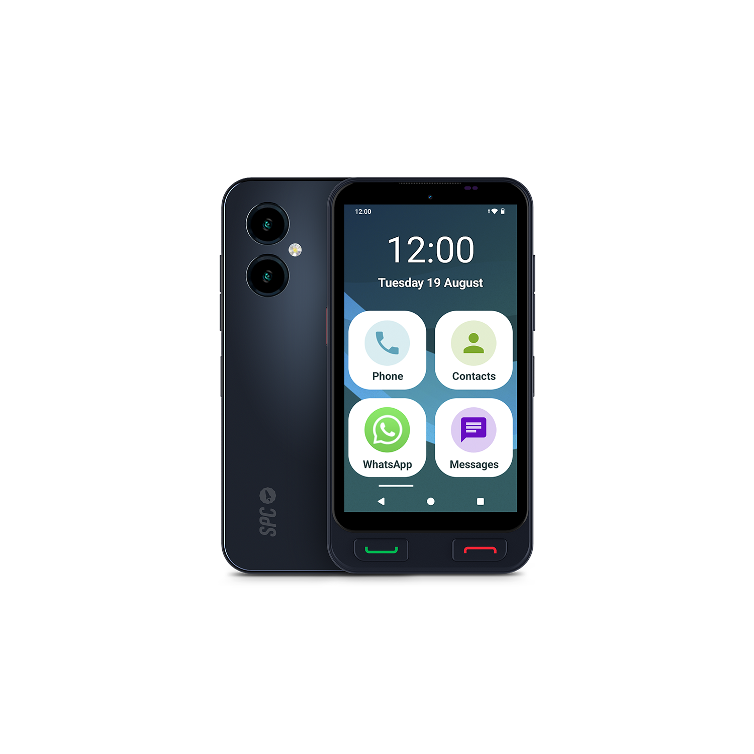 Smartphone 4G para pessoas idosas com ecrã de 5” e 64GB de armazenamento. Compatível com a app de gestão remota SPC Care para para que familiares possam fazer ajustes remotamente e conhecer a sua localização. Incorpora botões físicos, Modo Fácil com ícones XXL no ecrã, botão SOS reconhecível em vermelho, câmara 13MP, base de carregamento e es compatível com aparelhos auditivos.