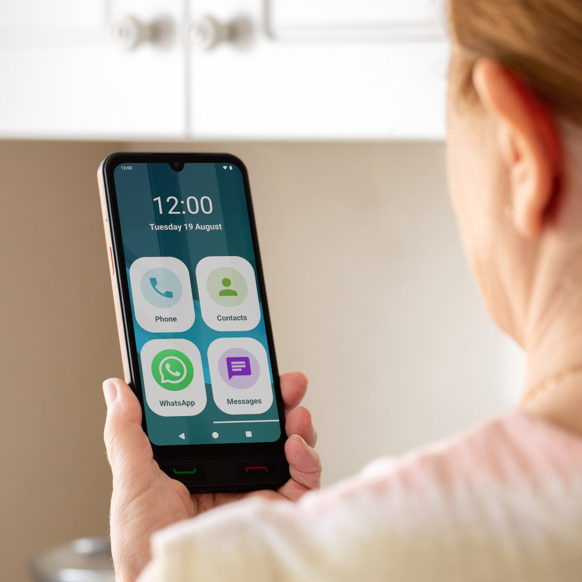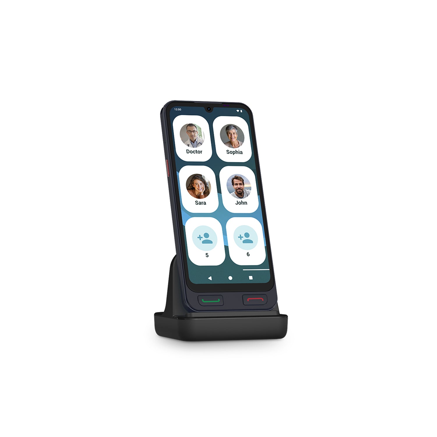 Smartphone 4G para pessoas idosas com ecrã de 6,1” e 128GB de armazenamento. Compatível com a app de gestão remota SPC Care para que os familiares possam fazer ajustes remotamente e conhecer a sua localização. Inclui botões físicos, Modo Fácil com ícones XXL no ecrã, câmara dupla de 50MP, botão SOS, base de carregamento, carregamento rápido e é compatível com auscultadores.